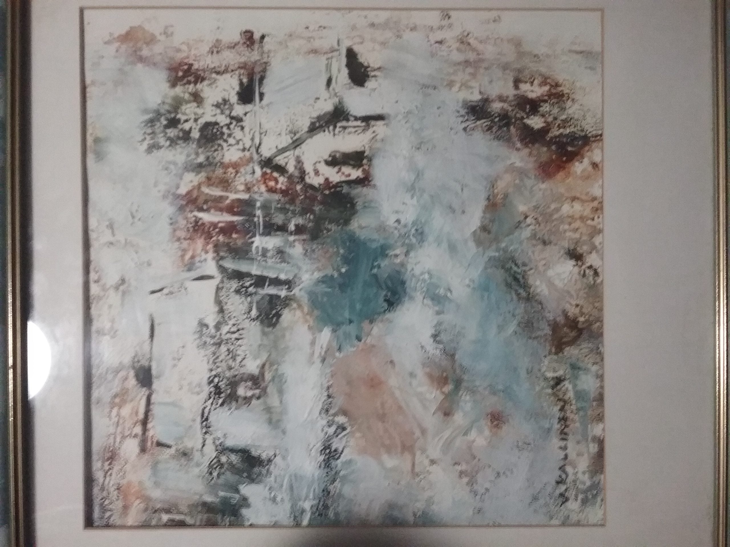 Kemissä vaikuttaneen Veikko Kallisen moderni maisema-aiheinen öljyvärimaalaus paperille. Maalattu luulatavsti 1984, signeerauksen vuosiluku hiukan epäselvä.